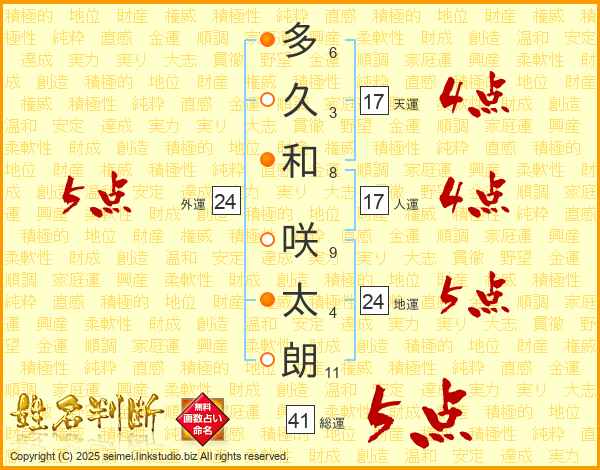 多久和咲太朗さんの総運は41画の5点!
