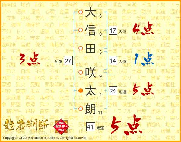 大(3画)信(9画)田(5画) 咲(9画)太(4画)朗(11画)