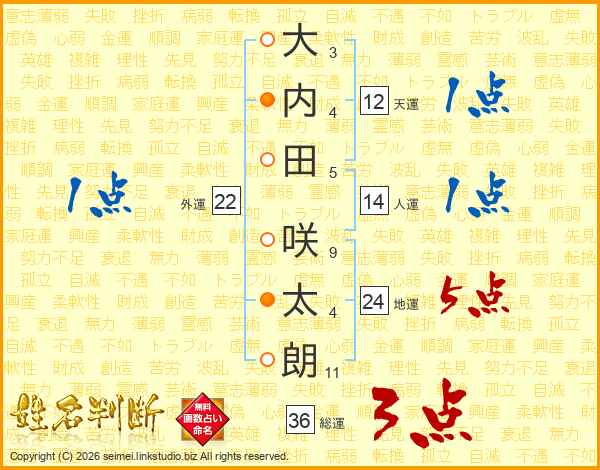 大(3画)内(4画)田(5画) 咲(9画)太(4画)朗(11画)