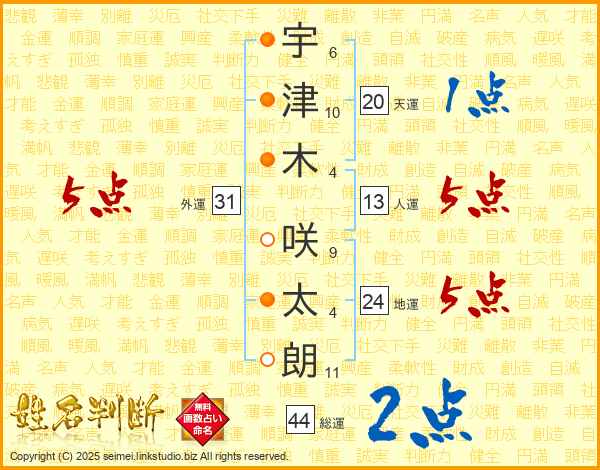 宇(6画)津(10画)木(4画) 咲(9画)太(4画)朗(11画)