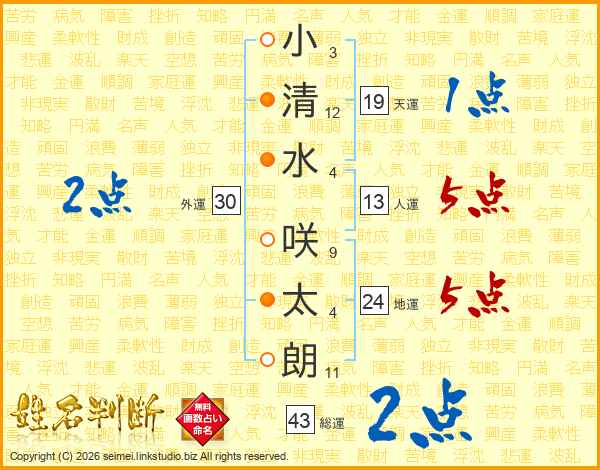 小(3画)清(12画)水(4画) 咲(9画)太(4画)朗(11画)