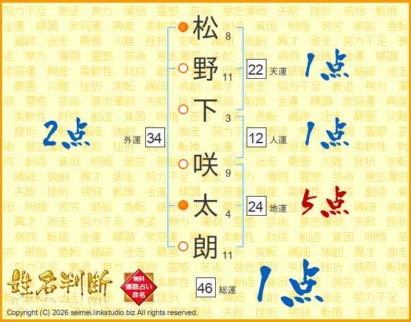 松(8画)野(11画)下(3画) 咲(9画)太(4画)朗(11画)