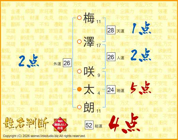 梅(11画)澤(17画) 咲(9画)太(4画)朗(11画)