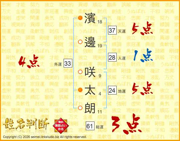 濱(18画)邊(19画) 咲(9画)太(4画)朗(11画)
