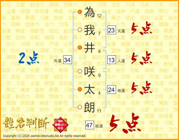 為(12画)我(7画)井(4画) 咲(9画)太(4画)朗(11画)
