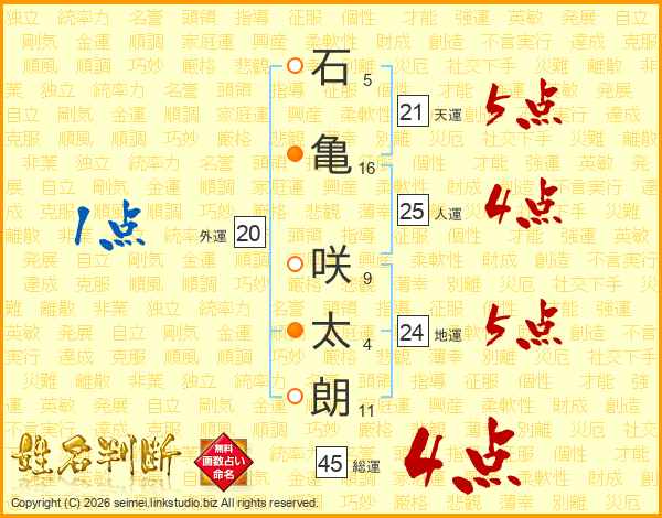 石(5画)亀(16画) 咲(9画)太(4画)朗(11画)