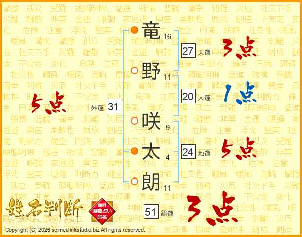 竜(16画)野(11画) 咲(9画)太(4画)朗(11画)