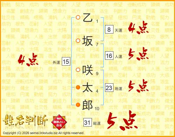 乙(1画)坂(7画) 咲(9画)太(4画)郎(10画)