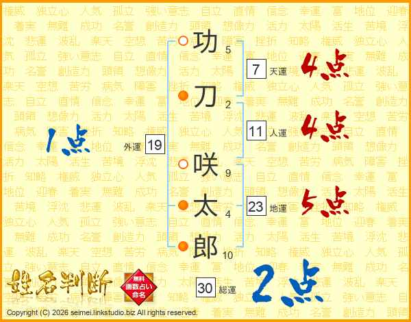功(5画)刀(2画) 咲(9画)太(4画)郎(10画)