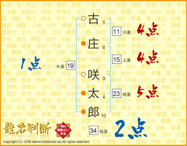 古(5画)庄(6画) 咲(9画)太(4画)郎(10画)
