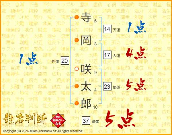 寺(6画)岡(8画) 咲(9画)太(4画)郎(10画)