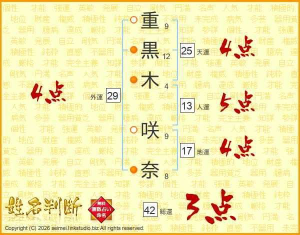 重(9画)黒(12画)木(4画) 咲(9画)奈(8画)