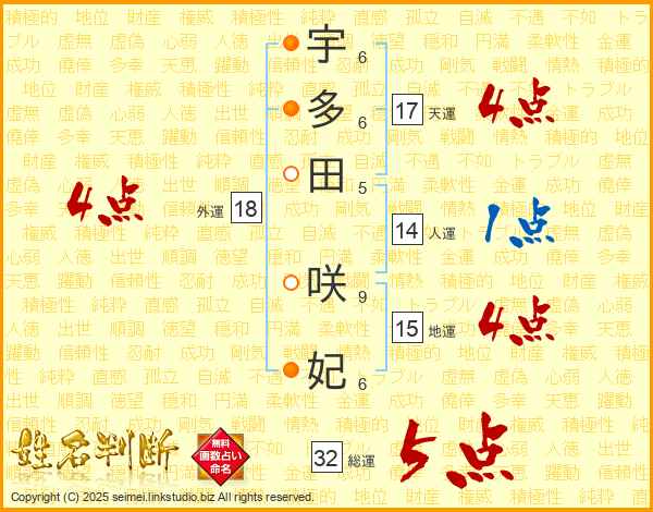 宇(6画)多(6画)田(5画) 咲(9画)妃(6画)