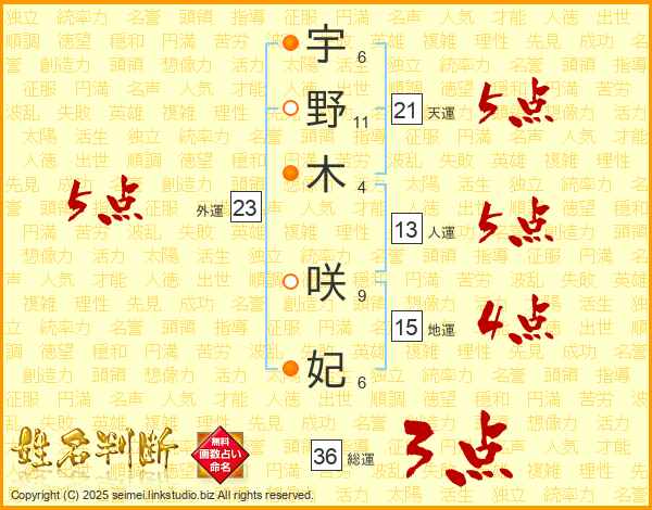 宇(6画)野(11画)木(4画) 咲(9画)妃(6画)