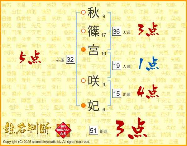 秋(9画)篠(17画)宮(10画) 咲(9画)妃(6画)