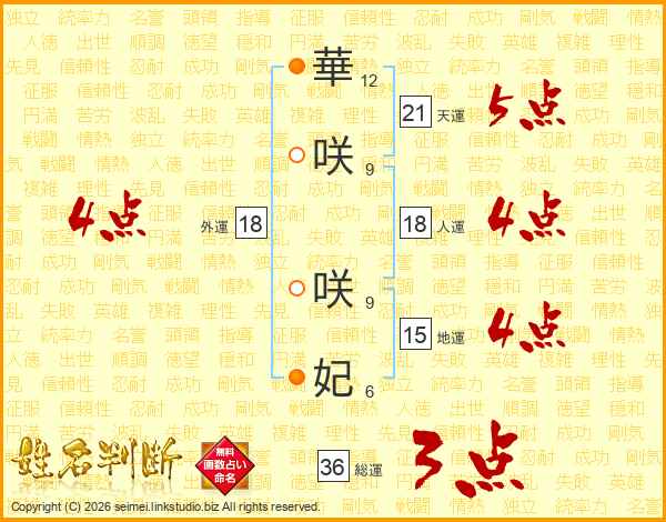 華(12画)咲(9画) 咲(9画)妃(6画)