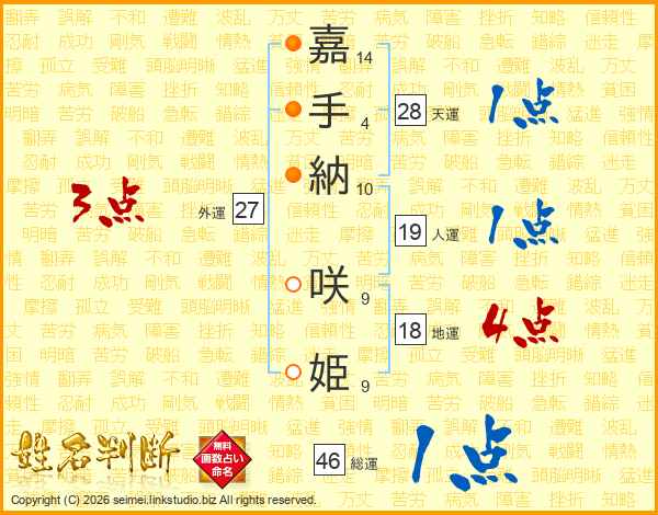 嘉(14画)手(4画)納(10画) 咲(9画)姫(9画)