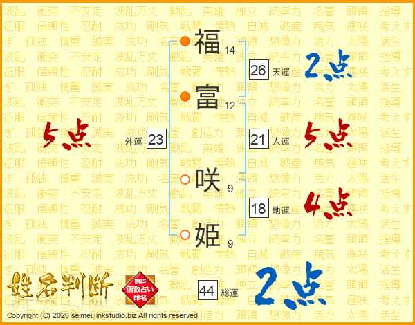 福(14画)富(12画) 咲(9画)姫(9画)