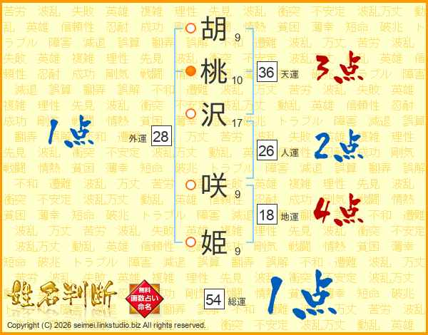 胡(9画)桃(10画)沢(17画) 咲(9画)姫(9画)