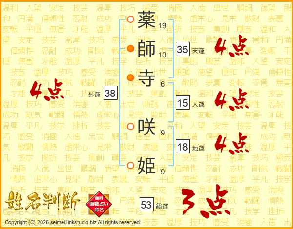 薬(19画)師(10画)寺(6画) 咲(9画)姫(9画)