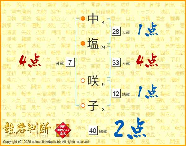 中(4画)塩(24画) 咲(9画)子(3画)