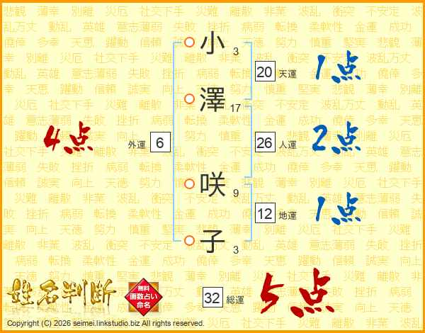 小(3画)澤(17画) 咲(9画)子(3画)