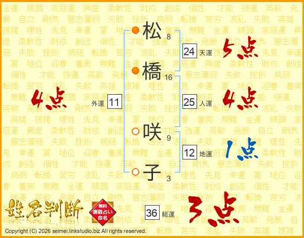 あなたの人生を表す1番重要な運勢です。生涯を通じて影響する総合運となり、主に50歳以降の晩年期に影響を及ぼします。苗字と名前の合計画数。
