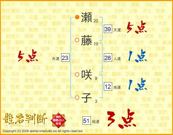 瀬藤咲子さんの総運は51画の3点!