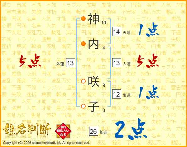 生活面を象徴する運勢です。外部から受ける影響力を表し、結婚運、家庭運や職場、環境への順応性を表します。総運から人運を引いた画数。姓や名が1文字の場合を除く。