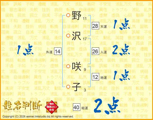 野沢咲子さんの総運は40画の2点!