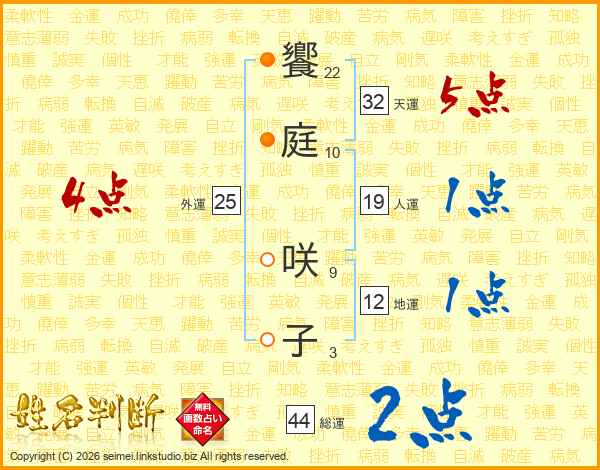 饗(22画)庭(10画) 咲(9画)子(3画)
