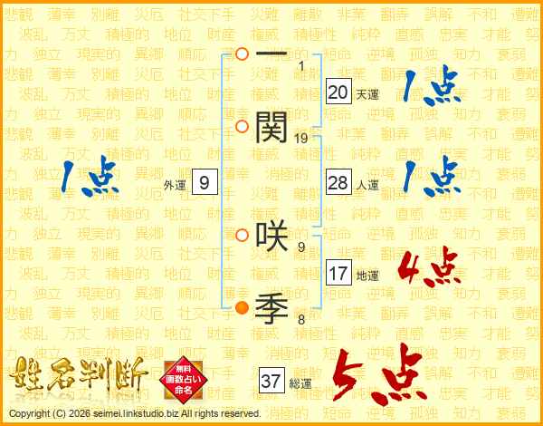 生活面を象徴する運勢です。外部から受ける影響力を表し、結婚運、家庭運や職場、環境への順応性を表します。総運から人運を引いた画数。姓や名が1文字の場合を除く。