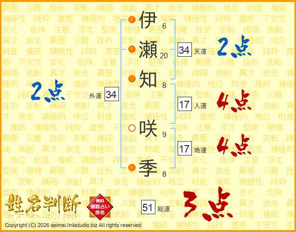 伊(6画)瀬(20画)知(8画) 咲(9画)季(8画)