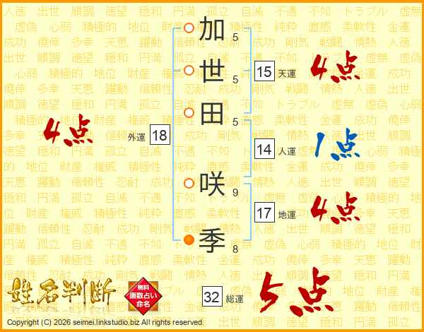 加(5画)世(5画)田(5画) 咲(9画)季(8画)