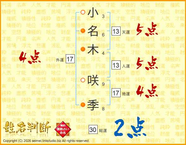 小(3画)名(6画)木(4画) 咲(9画)季(8画)