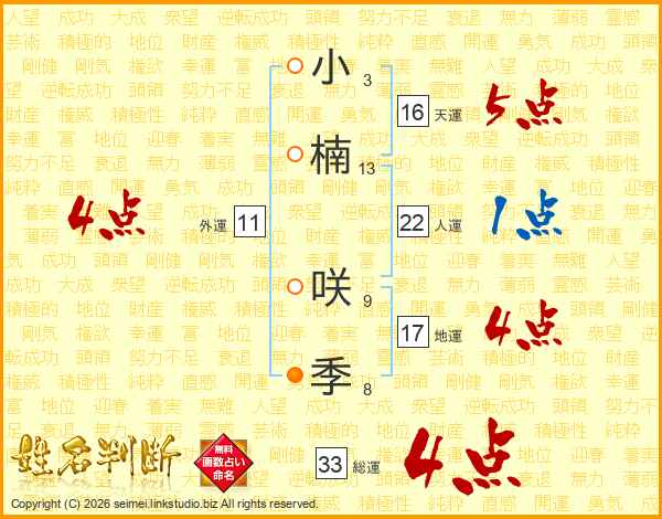 小楠咲季さんの総運は33画の4点!