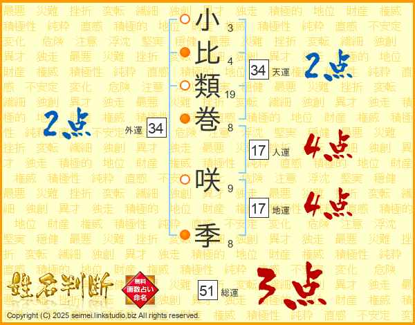 小(3画)比(4画)類(19画)巻(8画) 咲(9画)季(8画)