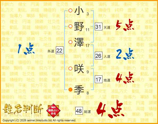 小(3画)野(11画)澤(17画) 咲(9画)季(8画)