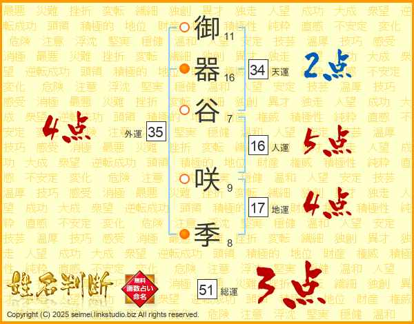 御(11画)器(16画)谷(7画) 咲(9画)季(8画)