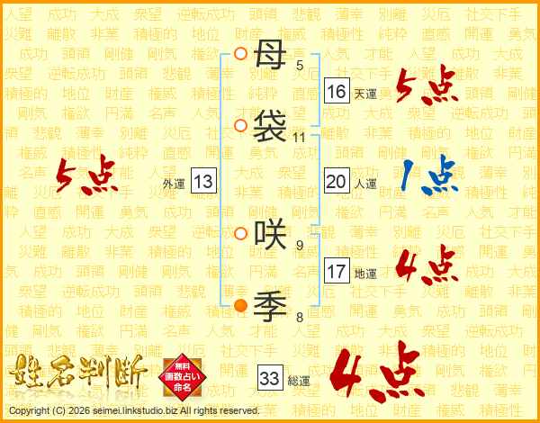 母(5画)袋(11画) 咲(9画)季(8画)