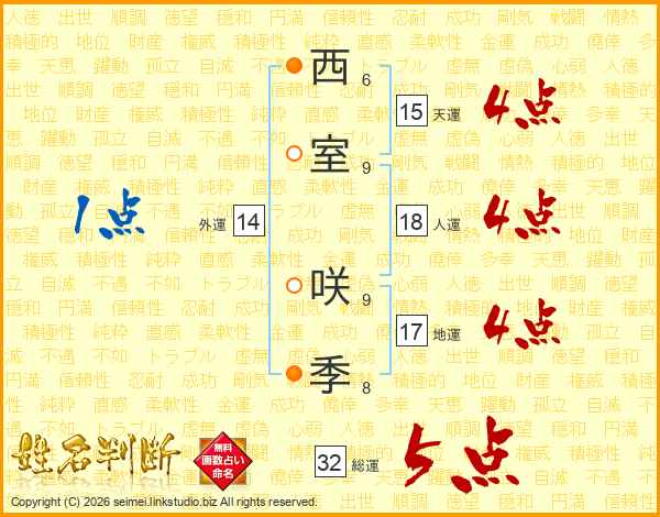 西(6画)室(9画) 咲(9画)季(8画)