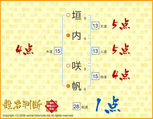 垣(9画)内(4画) 咲(9画)帆(6画)