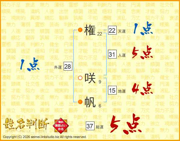 権咲帆さんの総運は37画の5点!
