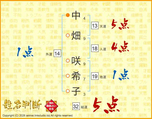 中(4画)畑(9画) 咲(9画)希(7画)子(3画)