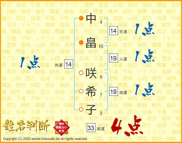 中(4画)畠(10画) 咲(9画)希(7画)子(3画)