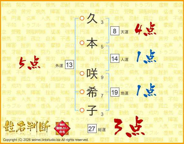 久(3画)本(5画) 咲(9画)希(7画)子(3画)