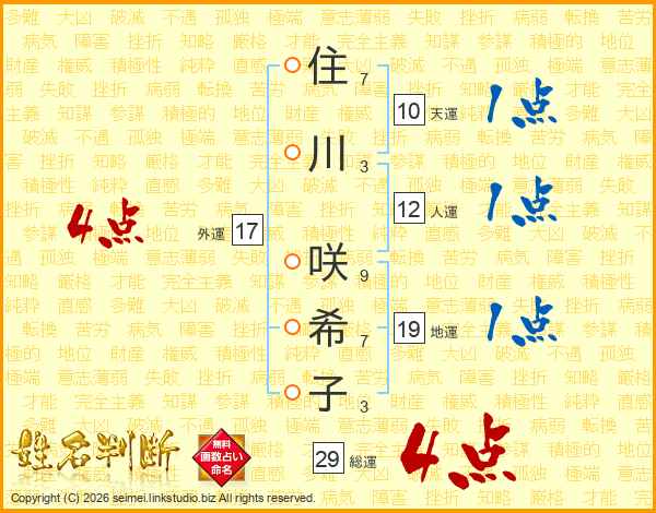 住(7画)川(3画) 咲(9画)希(7画)子(3画)