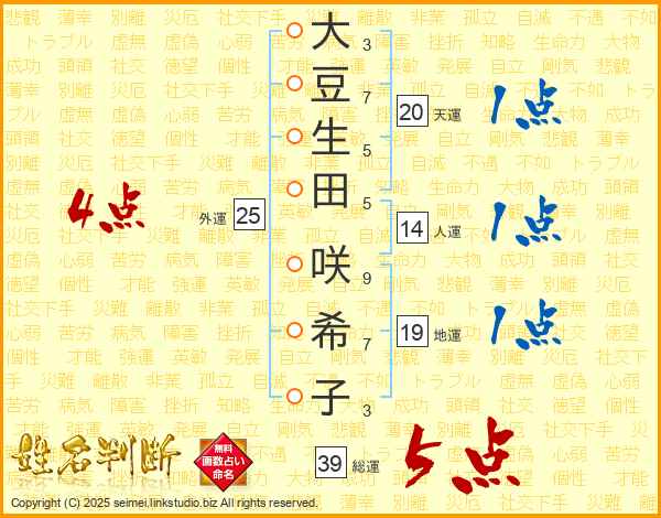 大(3画)豆(7画)生(5画)田(5画) 咲(9画)希(7画)子(3画)