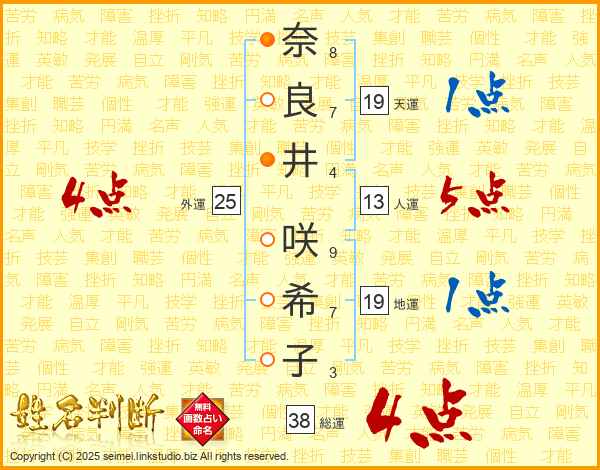 奈(8画)良(7画)井(4画) 咲(9画)希(7画)子(3画)
