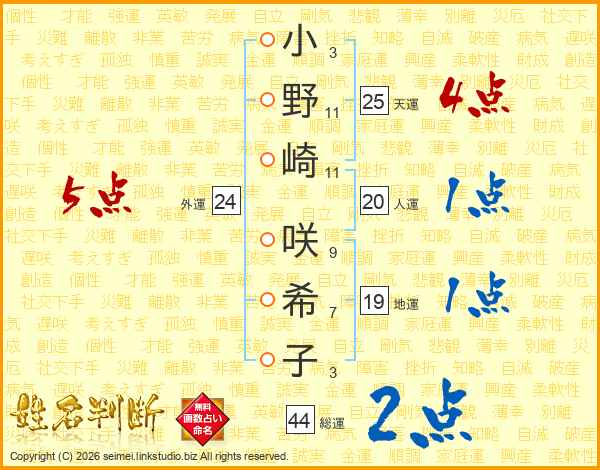 小野崎咲希子さんの総運は44画の2点!